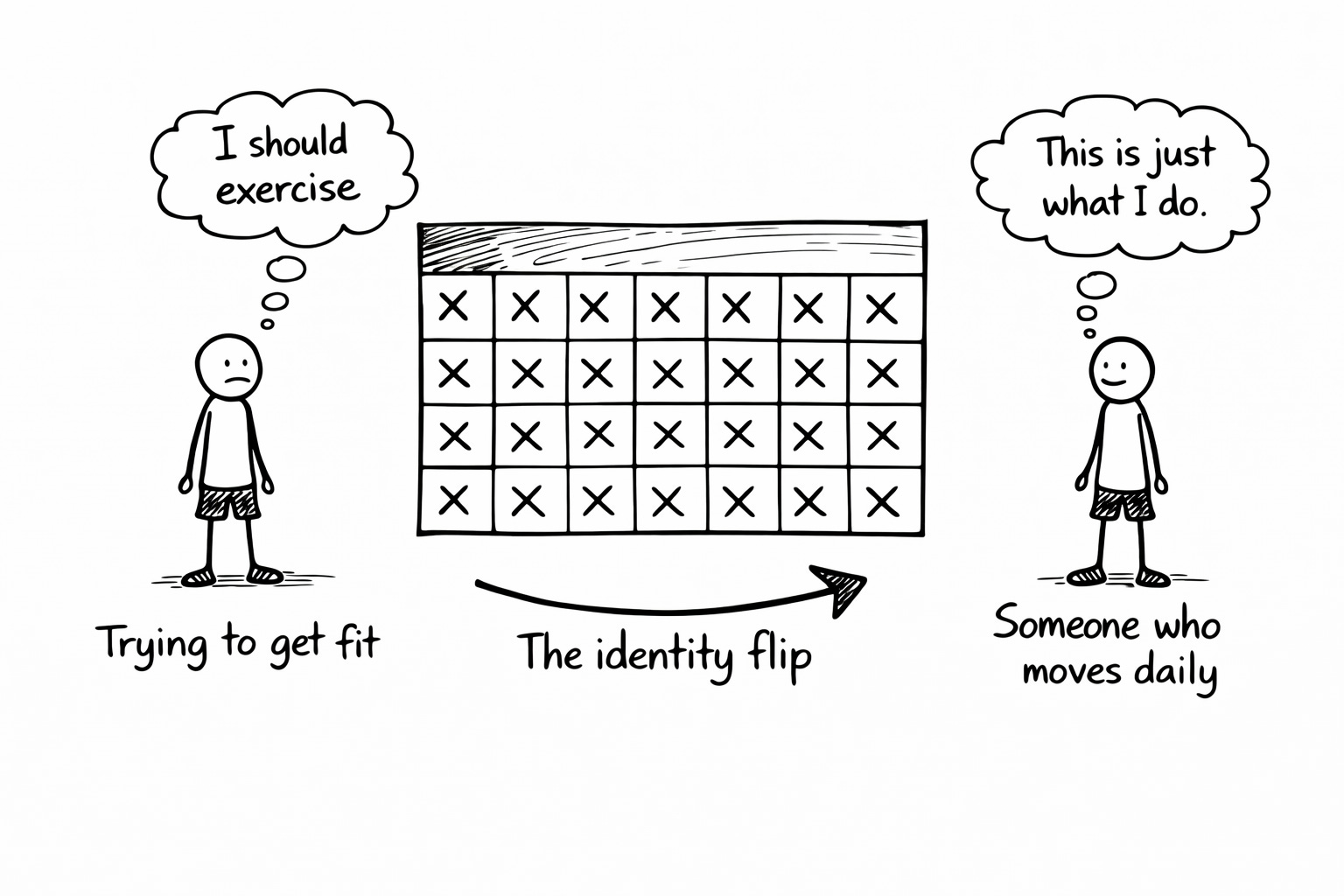 Do something for thirty days and you become “someone who does that thing.” Not someone trying to do that thing. Not someone who should do that thing. Someone who does it. Present tense. Part of who you are.