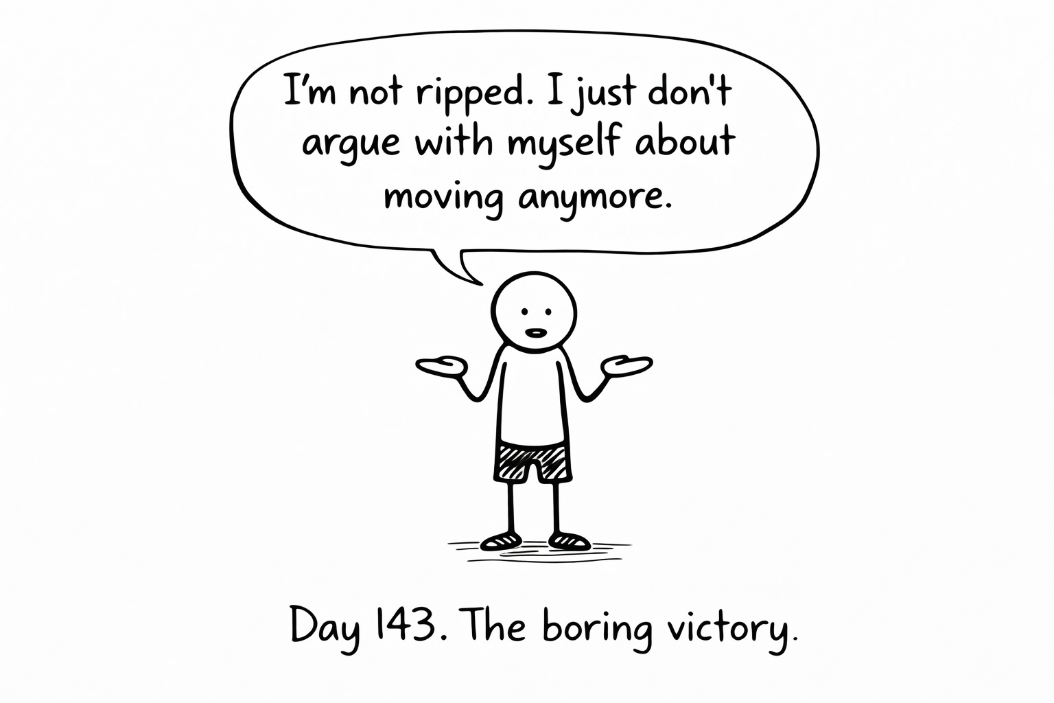 The daily negotiation stopped somewhere around day forty. The conversation ended. I just do it now. Morning coffee brewing, squats happening. Automatic. Boring. Sustainable.