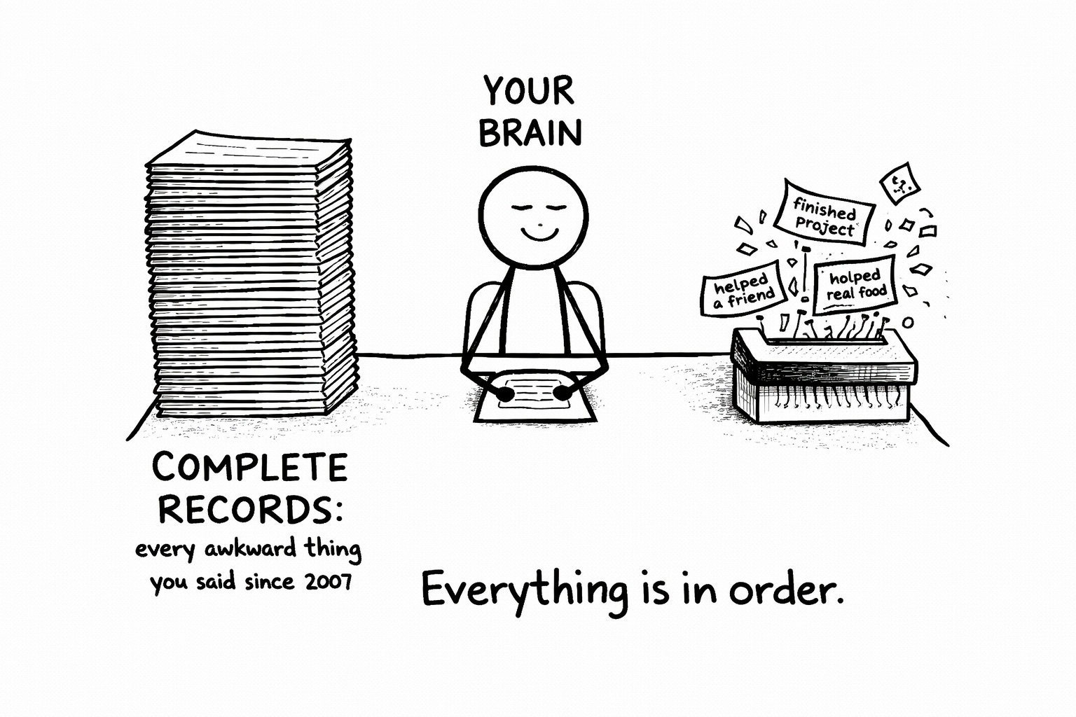 My brain had simply... redacted all of it. Filed it under “nothing special” while keeping a lovingly detailed archive of every awkward interaction, missed deadline, and evening spent eating crackers over the sink.