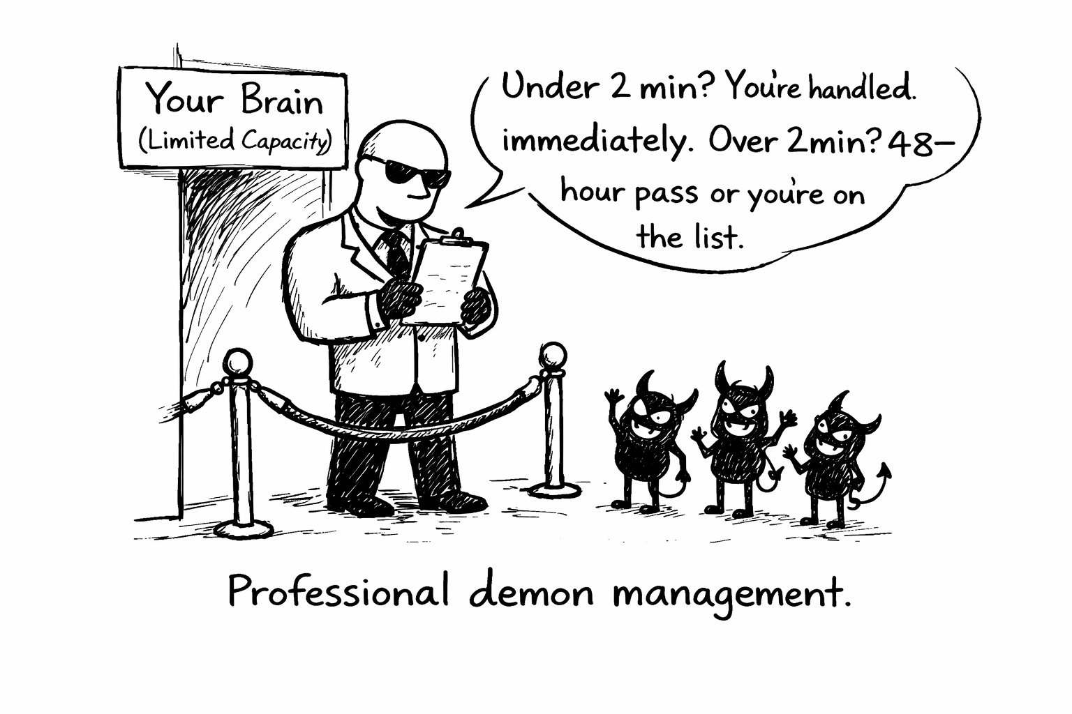 If it takes two to ten minutes but you genuinely can’t do it now, it has forty-eight hours to live. Either it gets done in that window, or it goes on the daily exorcism queue.