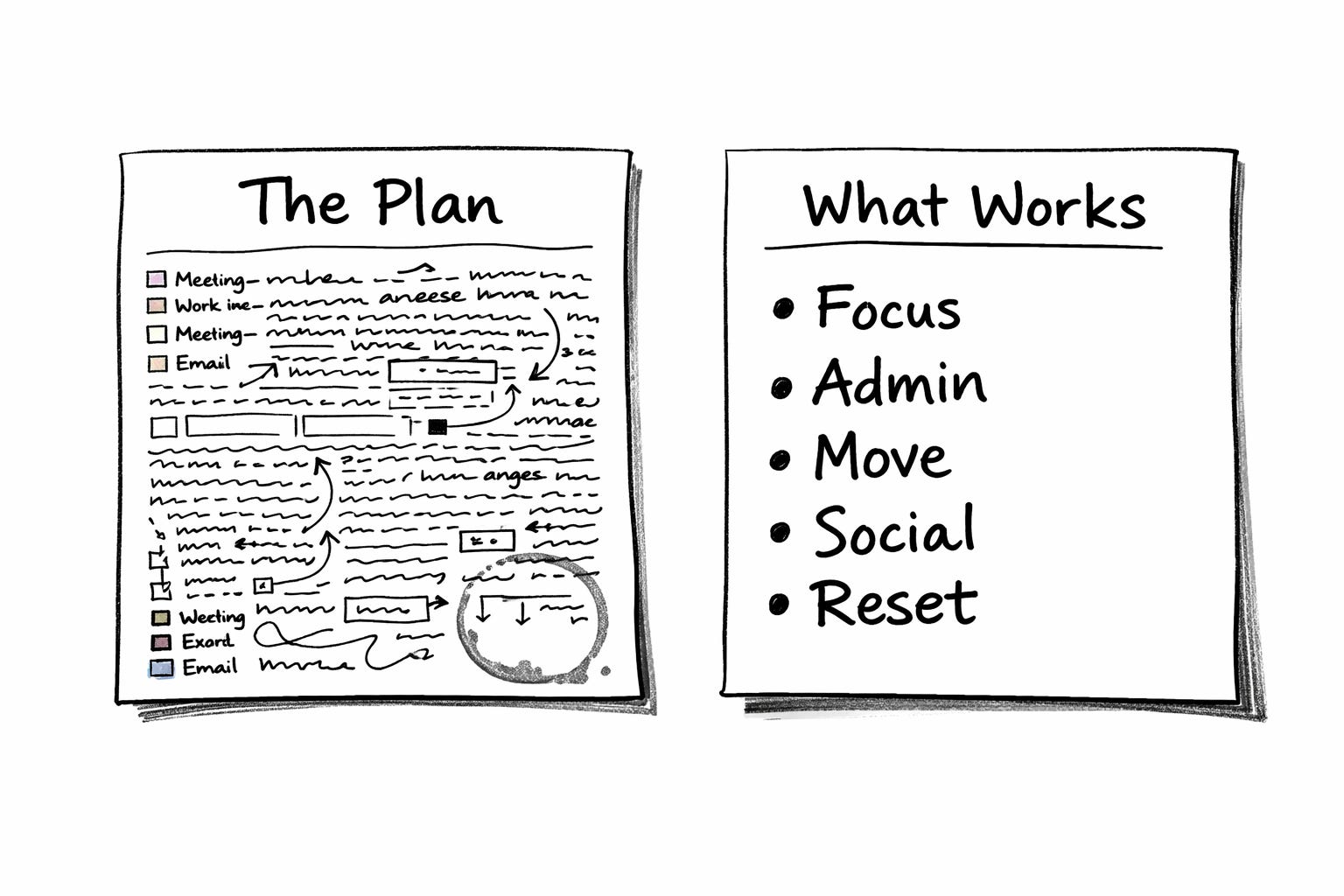 Sticky note, phone, back of your hand. That’s your whole planner now. No Trello boards. No Notion dashboards. No color-coded anything. (Building the system was the procrastination. We just couldn't admit it.)