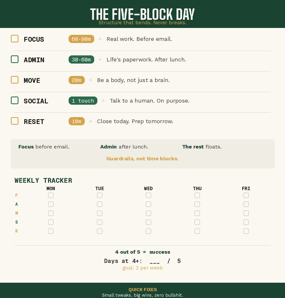 Keep it loose: Four out of five blocks = you won the day. Not five. Four. Leave room to be a human who occasionally stares at a wall for twenty minutes and calls it “processing.” (That’s not a block. But it probably should be.)